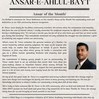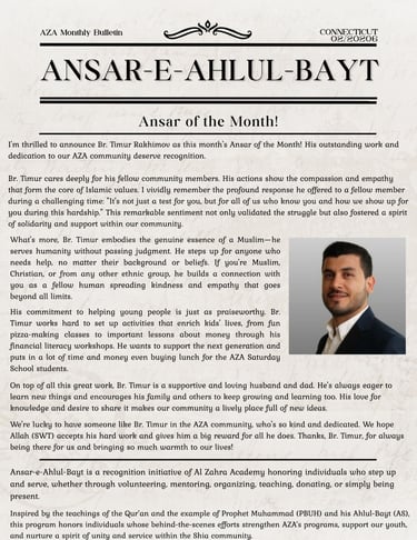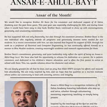 Ansar-e-Ahlul-Bayt is a recognition initiative of Al Zahra Academy honoring individuals who step up and serve, whether through volunteering, mentoring, organizing, teaching, or simply being present.